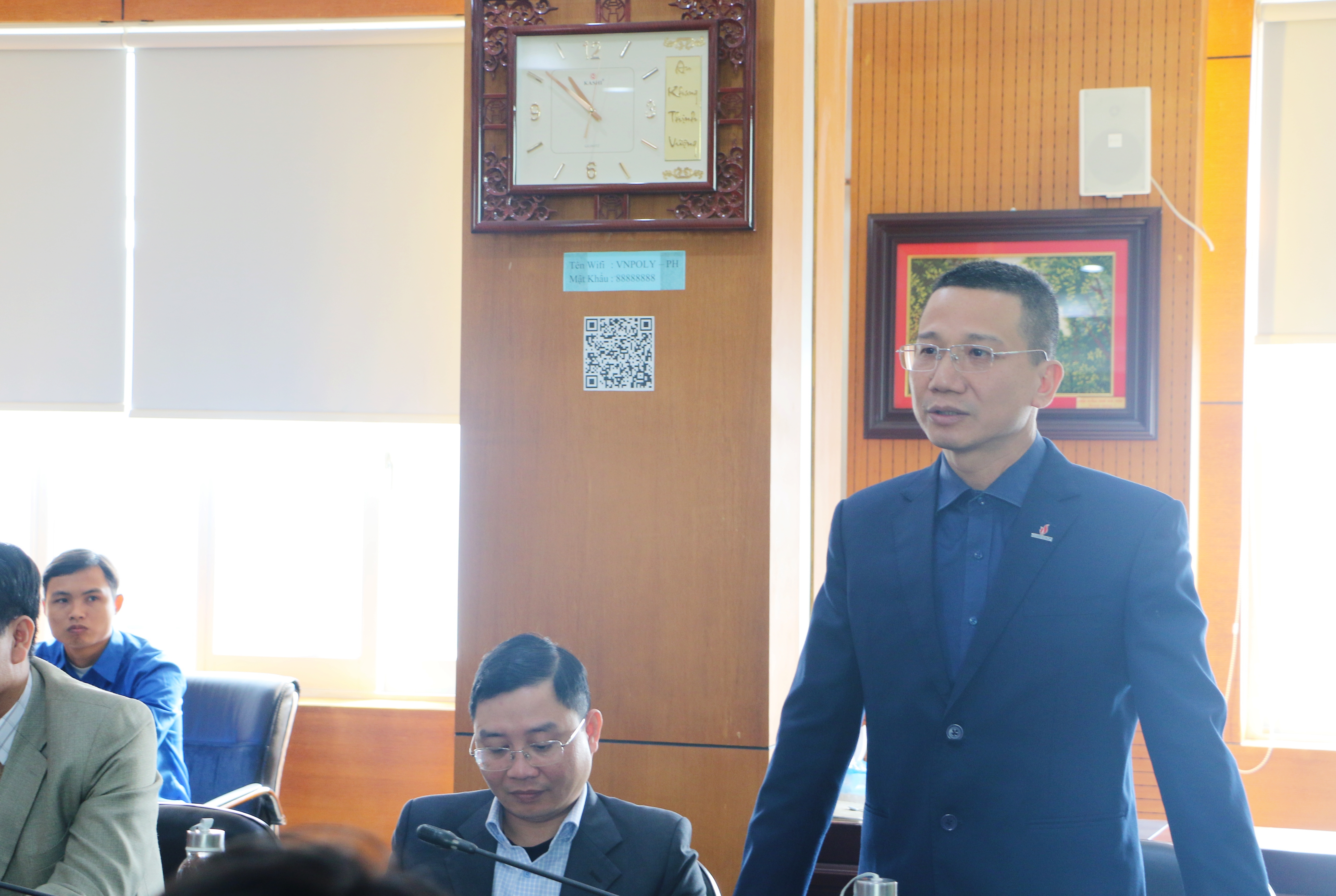 Tiếp đoàn công tác, về phía VNPOLY có: đồng chí Trần Huy Thư – Bí thư Đảng ủy, Tổng Giám đốc; đồng chí Đào Đình Huy – Phó Bí thư Đảng ủy, Phó Tổng Giám đốc; đồng chí Đỗ Đức Thắng – Phó Tổng Giám đốc; đồng chí Trần Thị Hoa – Chủ tịch Công đoàn Công ty; đồng chí Bùi Mạnh Hùng – Bí thư Đoàn Thanh niên cùng các đồng chí trong Ban Chấp hành Đoàn Thanh niên và đông đảo đoàn viên là người lao động VNPOLY.