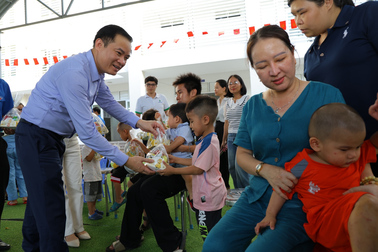 Đồng chí Lê Ngọc Sơn trao quà cho các em nhỏ đang được nuôi dưỡng ở Trung tâm