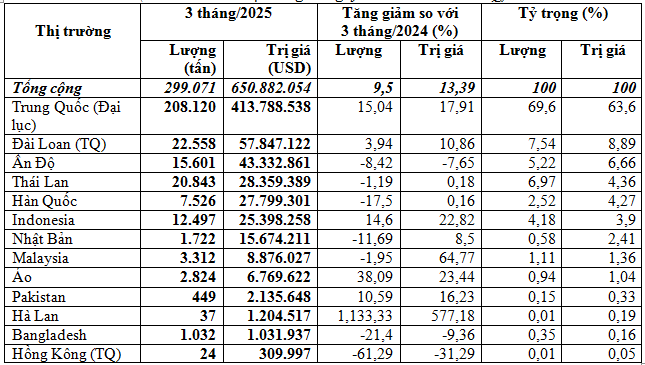 Tính chung cả 3 tháng đầu năm 2025 nhập khẩu nhóm hàng này đạt 299.071 tấn, tương đương 650,88 triệu USD, tăng 9,5% về lượng và tăng 13,4% về kim ngạch so với 3 tháng đầu năm 2024. Giá trung bình trong cả 3 tháng đạt 2.176,4 USD/tấn, tăng 3,6% so với 3 tháng đầu năm 2024.