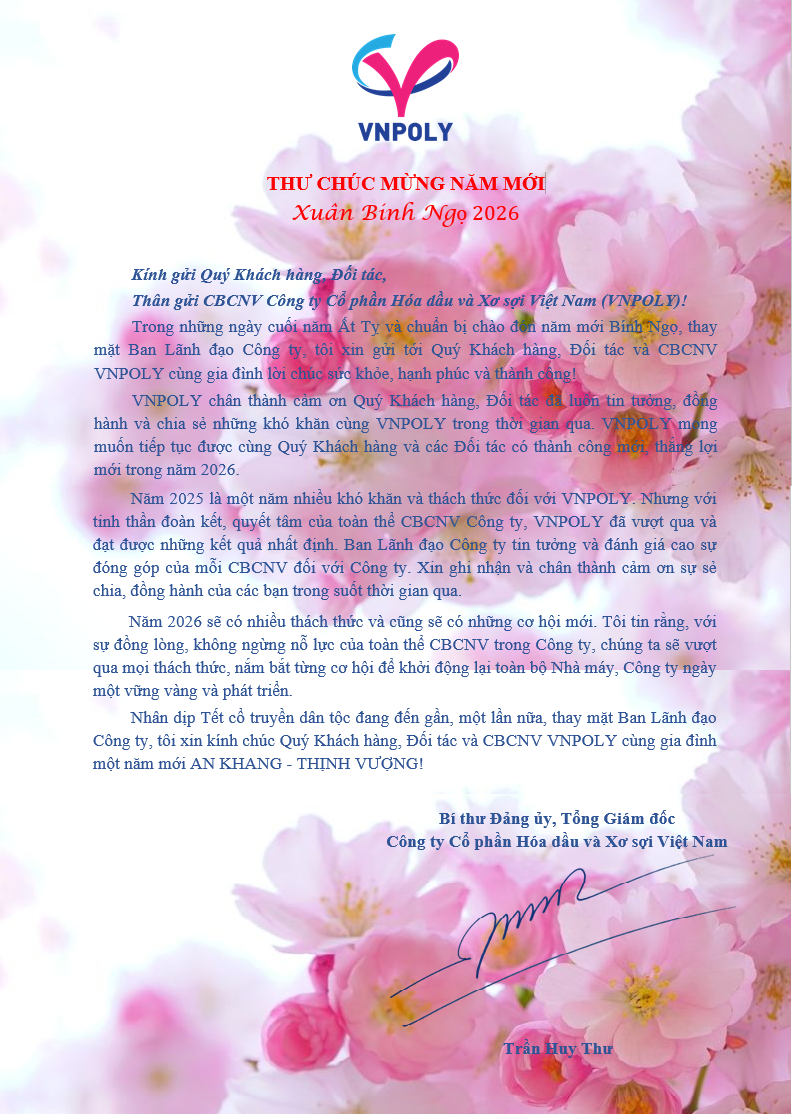 Nhân dịp đón Xuân Bính Ngọ, Bí thư Đảng ủy, Tổng Giám đốc Công ty Cổ phần Hóa dầu và Xơ sợi Việt Nam (VNPOLY) đã gửi thư chúc mừng năm mới tới Quý Khách hàng, Đối tác và CBCNV VNPOLY. Dưới đây là toàn văn bức thư: