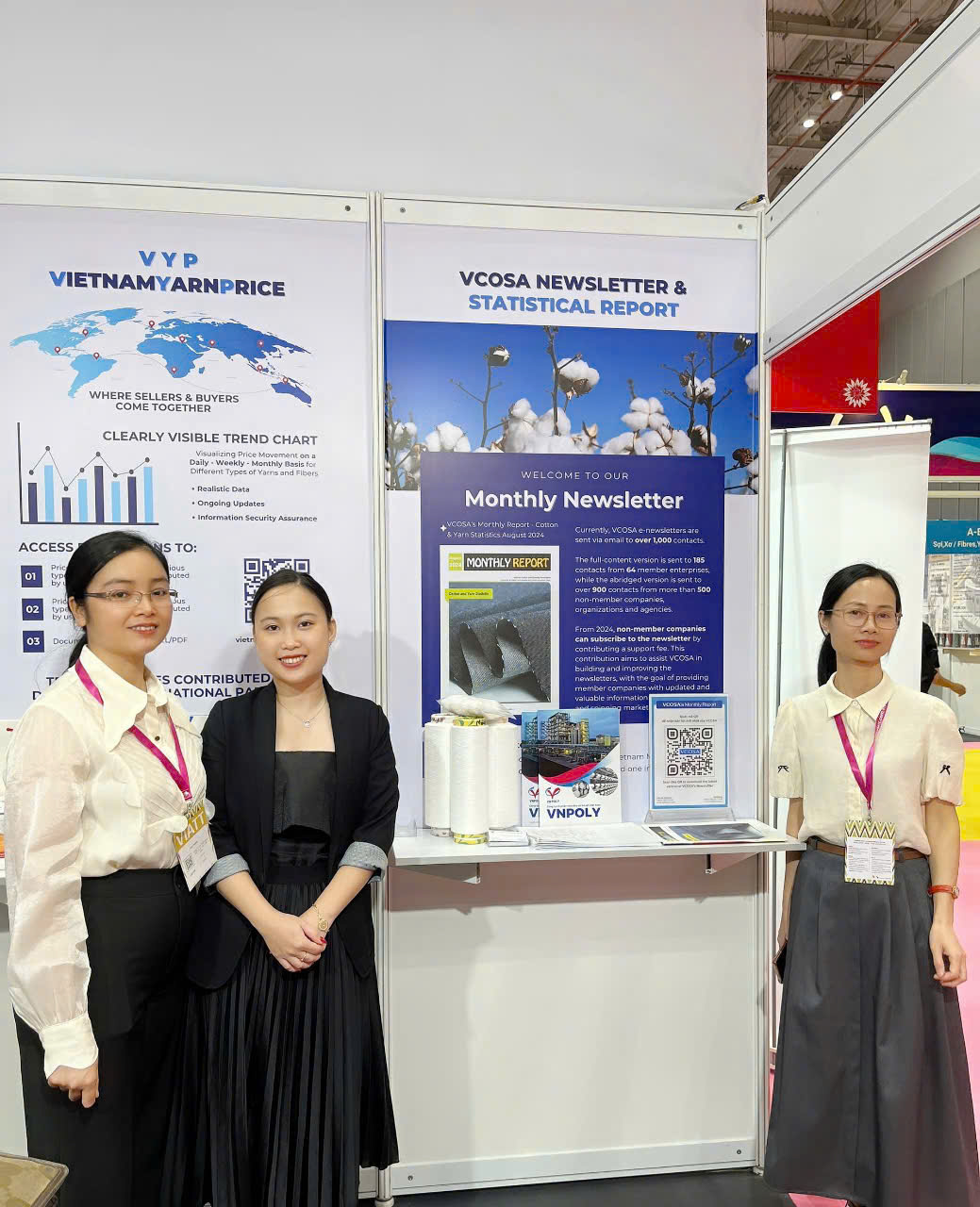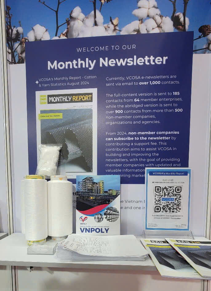 VNPOLY tham gia gian hàng chung của VCOSA (Hiệp hội Bông sợi Việt Nam). Việc tham gia triển lãm là dịp để VNPOLY tiếp xúc với nhiều khách hàng mới trong và ngoài nước. Đồng thời, VNPOLY có thể tìm hiểu thêm về các nhà cung cấp nguyên liệu mới, mở ra nhiều cơ hội hợp tác trong tương lai.