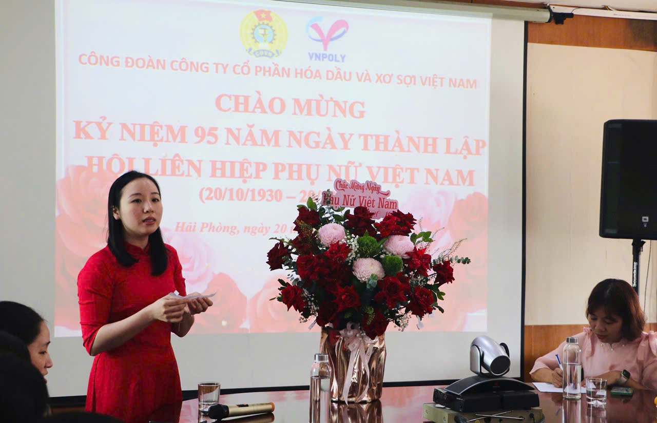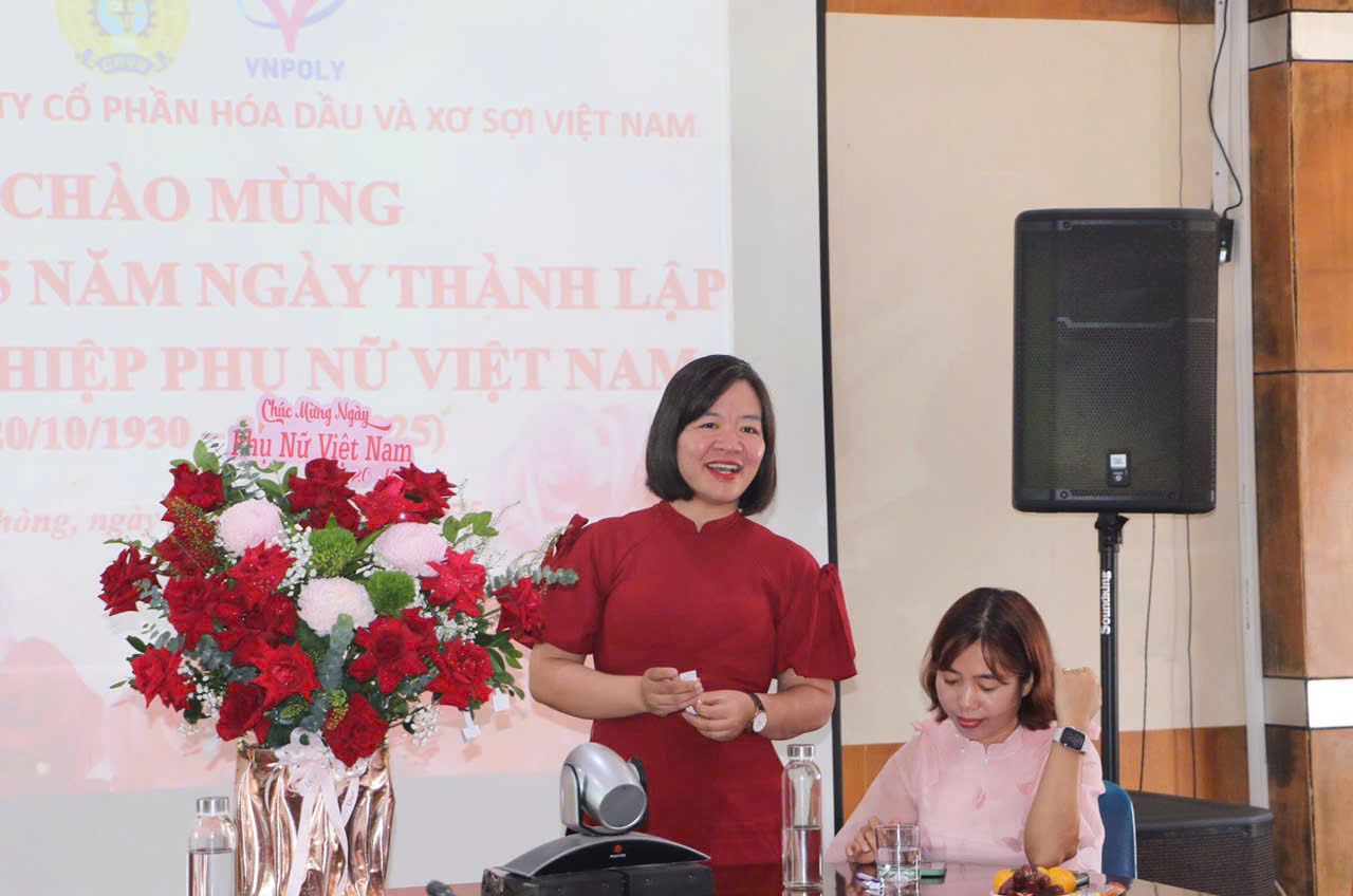 Tại đây, đại diện Ban Nữ công VNPOLY, Trưởng Ban Trần Thị Hoa đã báo cáo một số hoạt động nổi bật của các nữ CBCNV VNPOLY trong thời gian qua. Dù trong điều kiện khó khăn nhưng các nữ CBCNV VNPOLY không chỉ hoàn thành công việc chuyên môn mà còn tích cực tham gia các hoạt động đoàn thể nhằm nâng cao đời sống tinh thần. Đặc biệt, Ban Nữ công VNPOLY còn có các hoạt động ý nghĩa như: Mở Chợ Nữ công để gây quỹ dành cho hoạt động thiện nguyện, ủng hộ áo dài cho chị em vùng cao, quyên góp ủng hộ nữ CBCNV có hoàn cảnh đặc biệt khó khăn và đồng bào chịu ảnh hưởng nặng nề bởi bão lũ...
